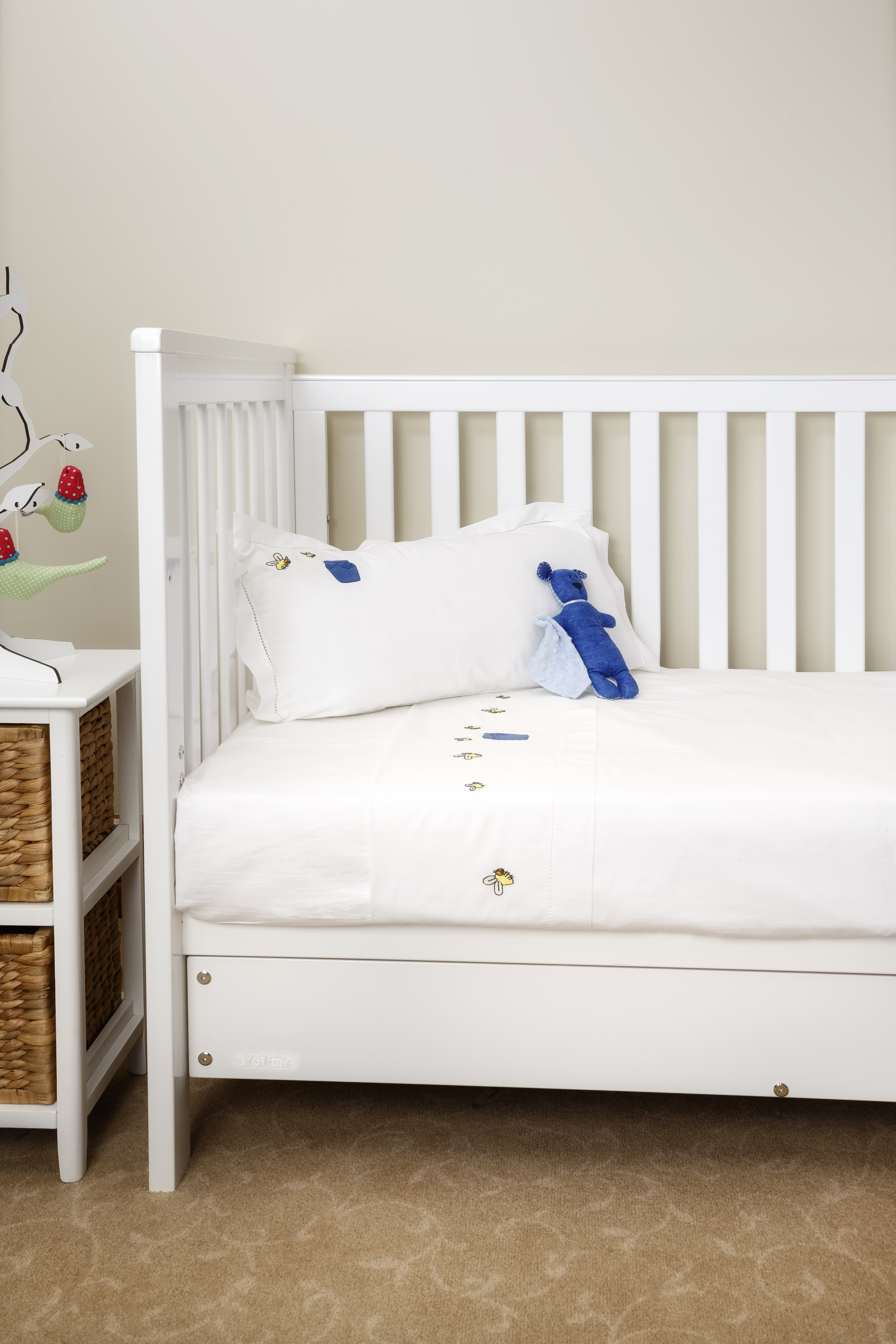 This beautiful handcrafted unisex design will brighten up any nursery. Made with 100% cotton, this sheet set which consists of a fitted cot sheet, top sheet and pillowcase finished with a pull thread border. Available in one size only.