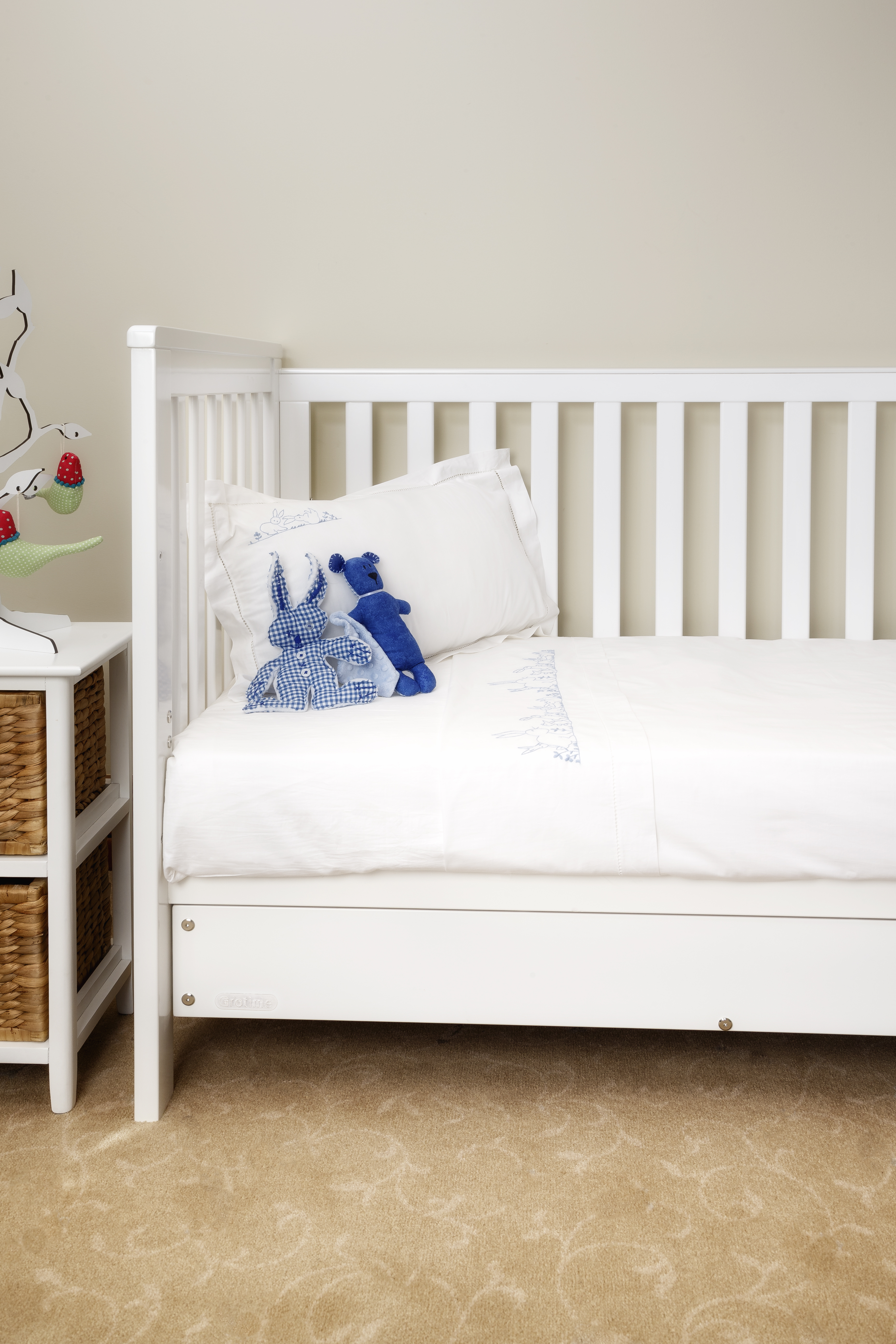 A gorgeous handcrafted cot sheet set, made on 100% cotton this sheet set consists of a fitted sheet, flat sheet and pillowcase. A pull thread border creates an elegant finish. Use on its own or complement it with a matching duvet cover. Available in one size only,. Also available in pink.