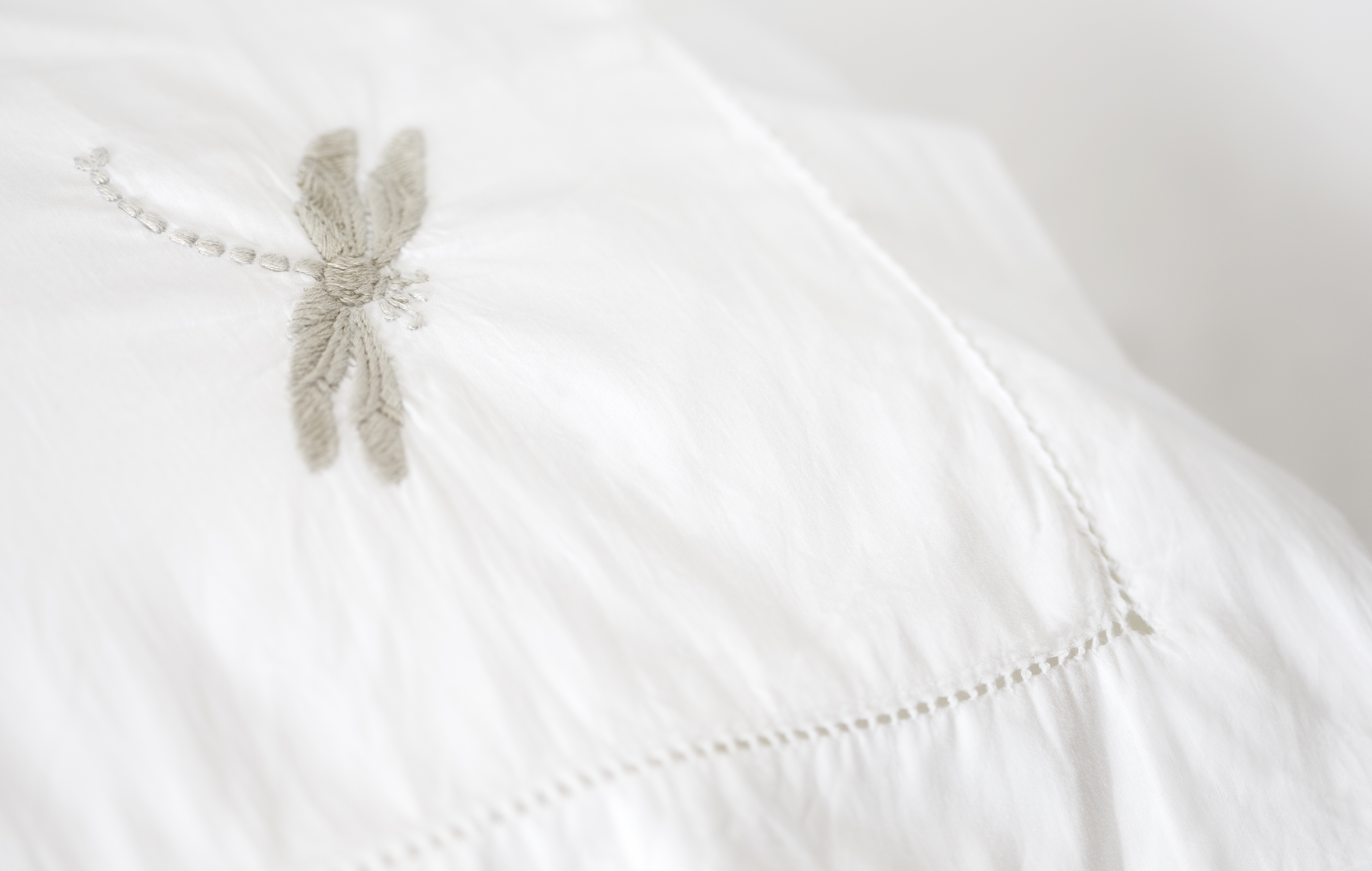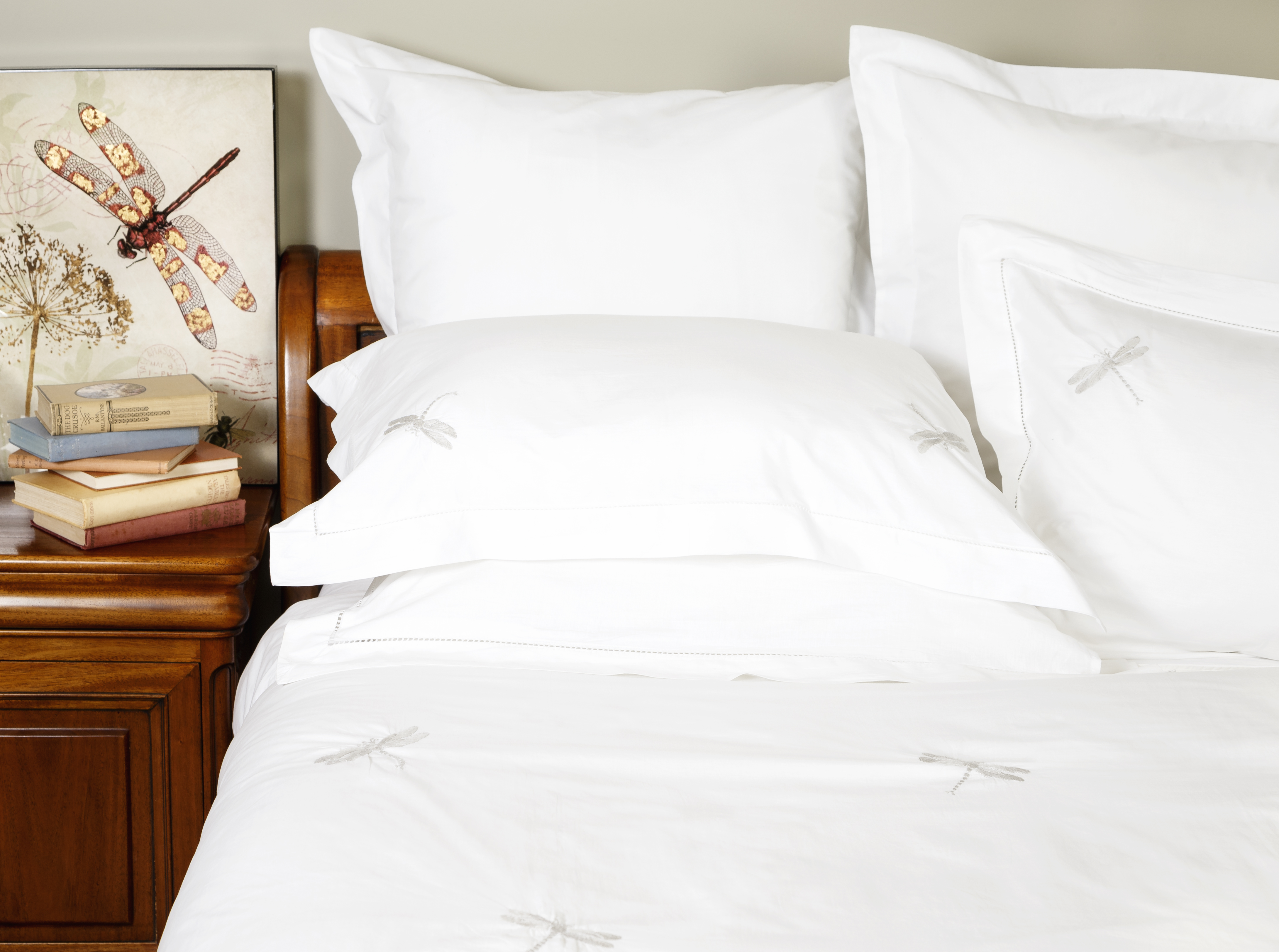 Handcrafted silver dragonflys on this 100% white cotton duvet create a stunning and elegant look for any bedroom. Features a pull thread border and two matching pillow cases. Available in both Queen and King sizes.