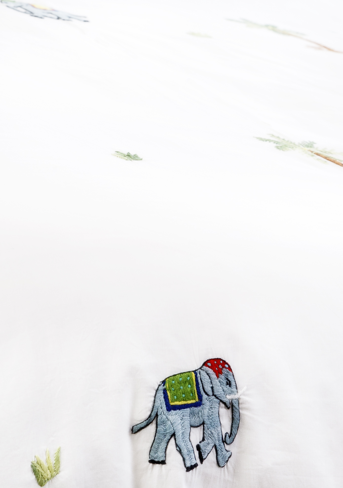 A beautiful handcrafted unisex design. This gorgeous elephant duvet is suitable for all children. Handcrafted in 100% cotton finished with a pull thread border. Comes with a matching pillowcase. Available in Single size.