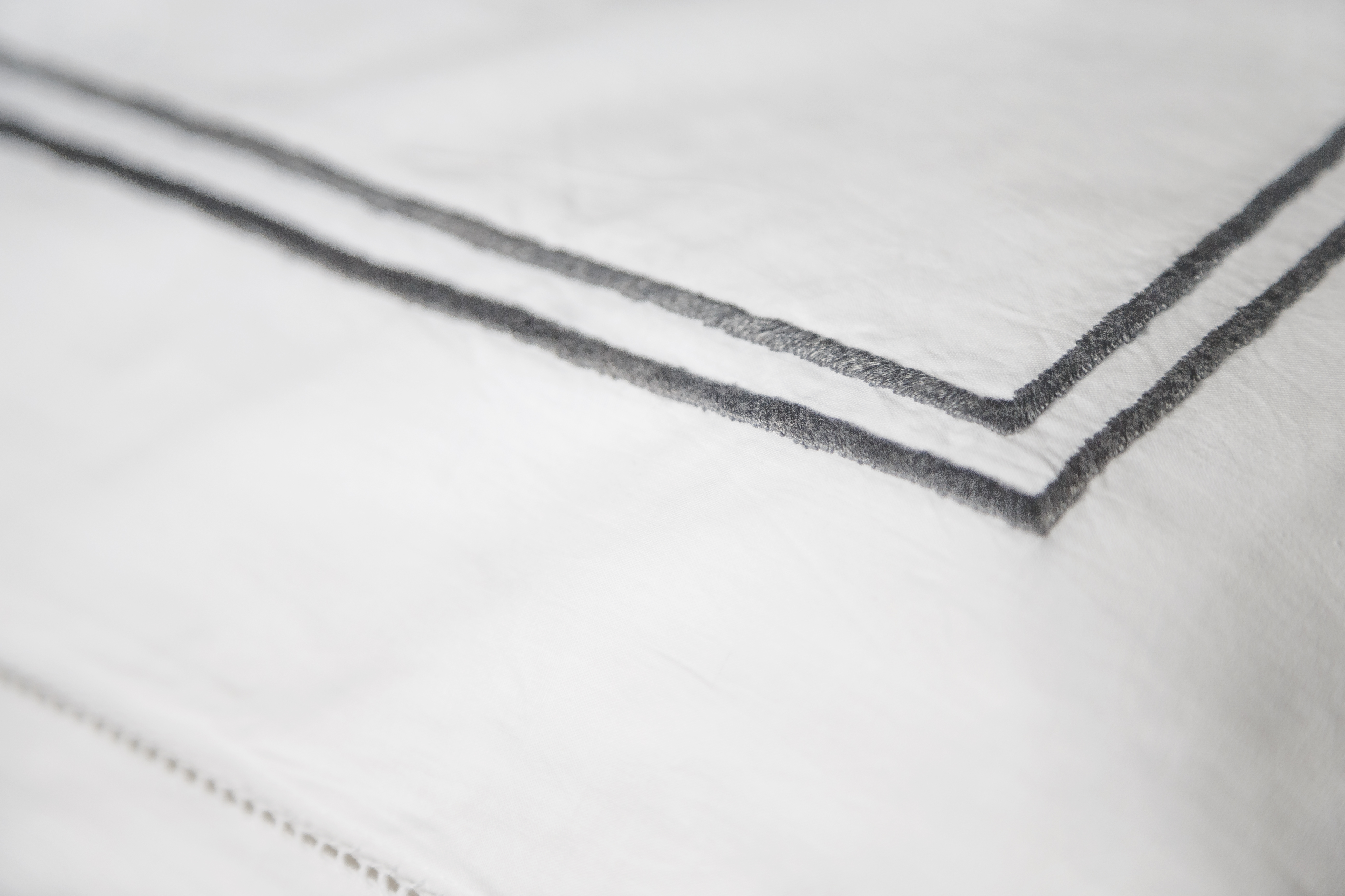 A contemporary handcrafted bold grey stripe design on a 100% white cotton fabric creates a sophisticated look for any bedroom. Features a handcrafted thread pull border. Includes two matching pillowcases. Available in queen and king sizes.