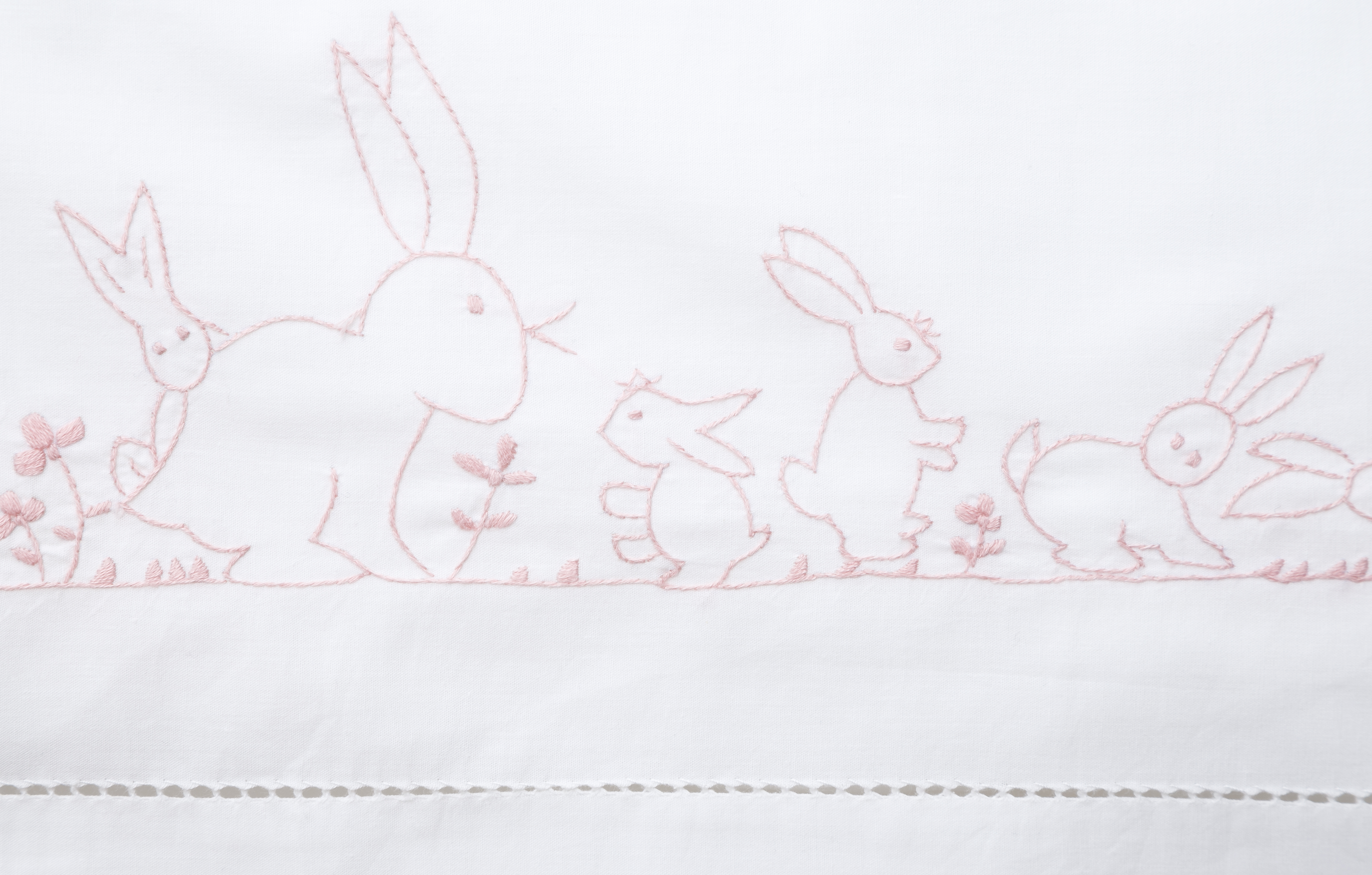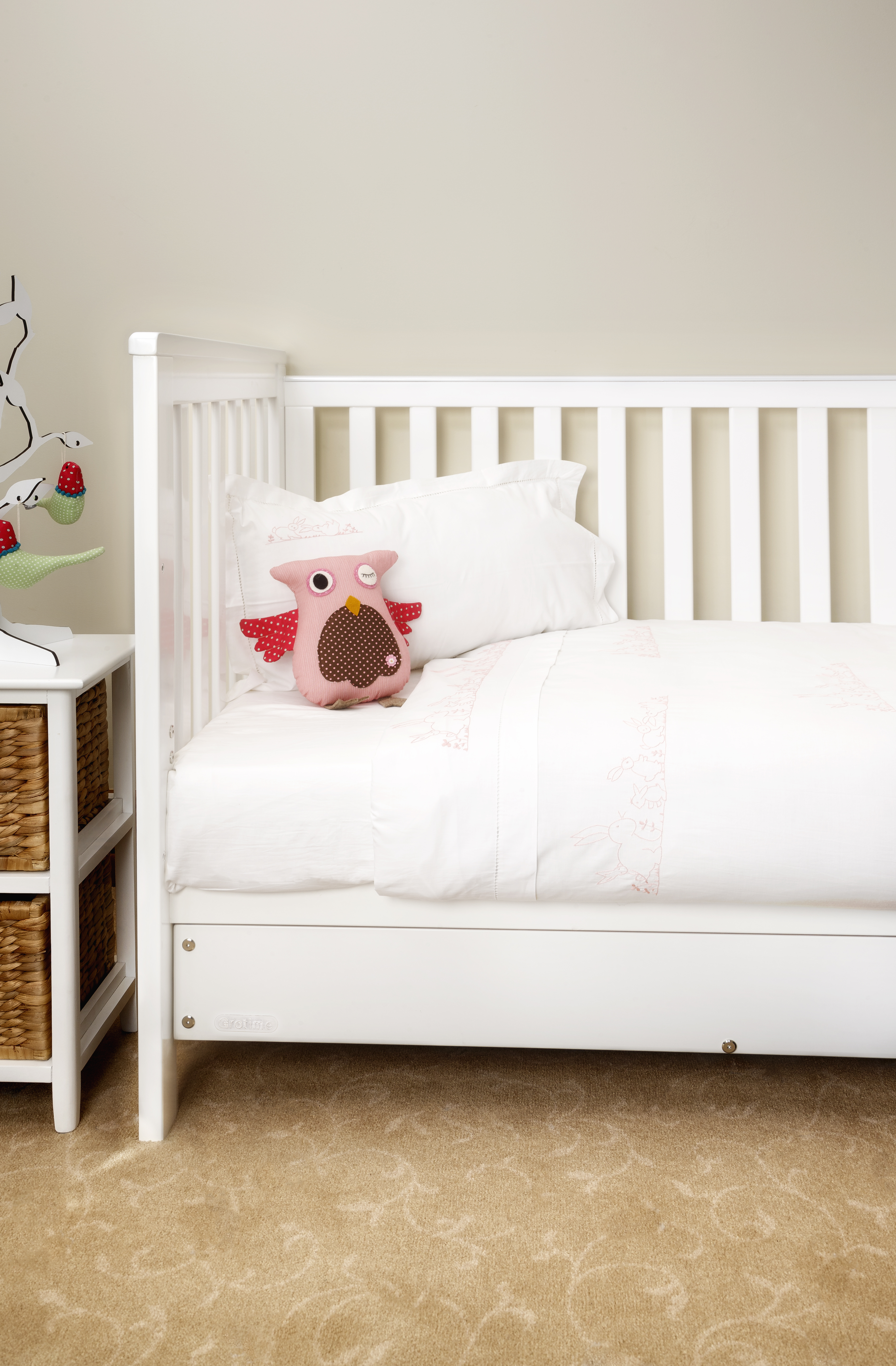 A gorgeous handcrafted cot sheet set, made on 100% cotton this sheet set consists of a fitted sheet, flat sheet and pillowcase. A pull thread border creates an elegant finish. Use on its own or complement it with a matching duvet cover. Available in one size only. Also available in blue.