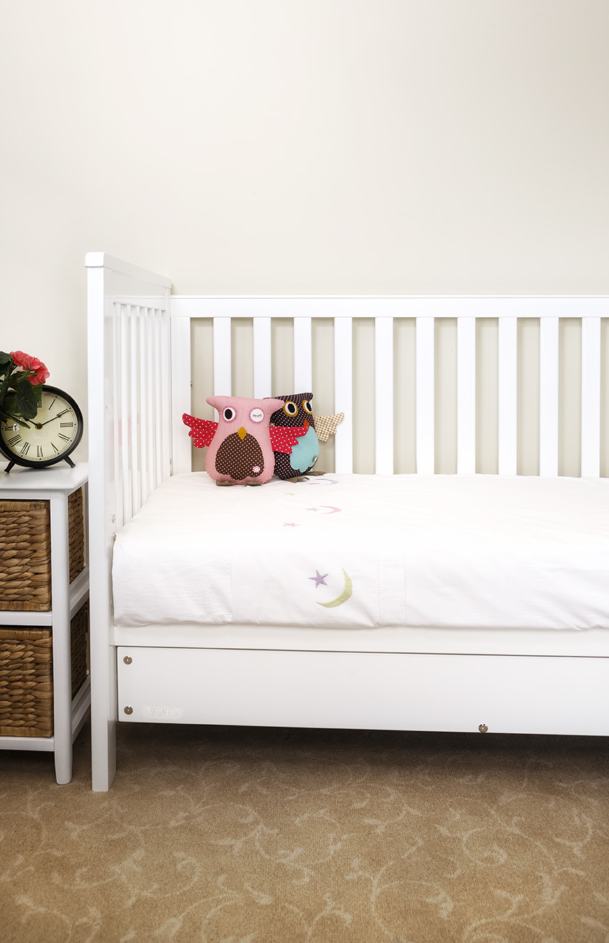 A unique design featuring the moon and stars in handcrafted pastel colours. Simple yet elegant with a pull thread border completed in 100% cotton. This sheet set includes one fitted sheet, one flat sheet and one pillowcase. Available in one size only.